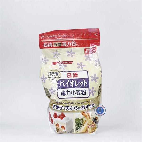 Bột mì Nhật Bản Nisshin Violet Komugiko 1Kg- Với bột có màu trắng, mịn, thường được dùng để làm bánh, làm bột chiên tempura, bột bao chiên rau củ, hoặc chế biến món ăn tùy thích.