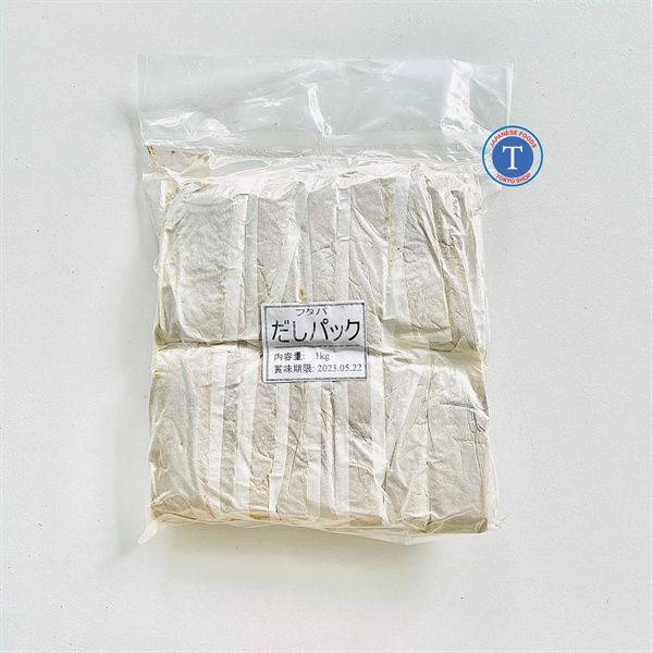 Nước Dùng Dashi được để trong túi lọc trà. Trong túi là hôn hợp rong biển Kombu và các loại cá bào của Nhật nghiền nhuyễn thành dạng bột.