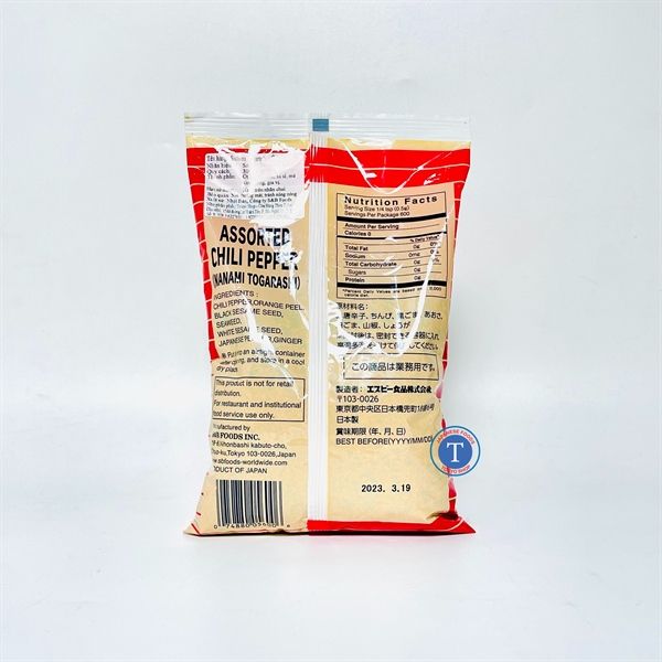 Thành phần: ớt, cam, hạt mè đen, hạt mè trắng, rong biển, ớt Nhật, gừng